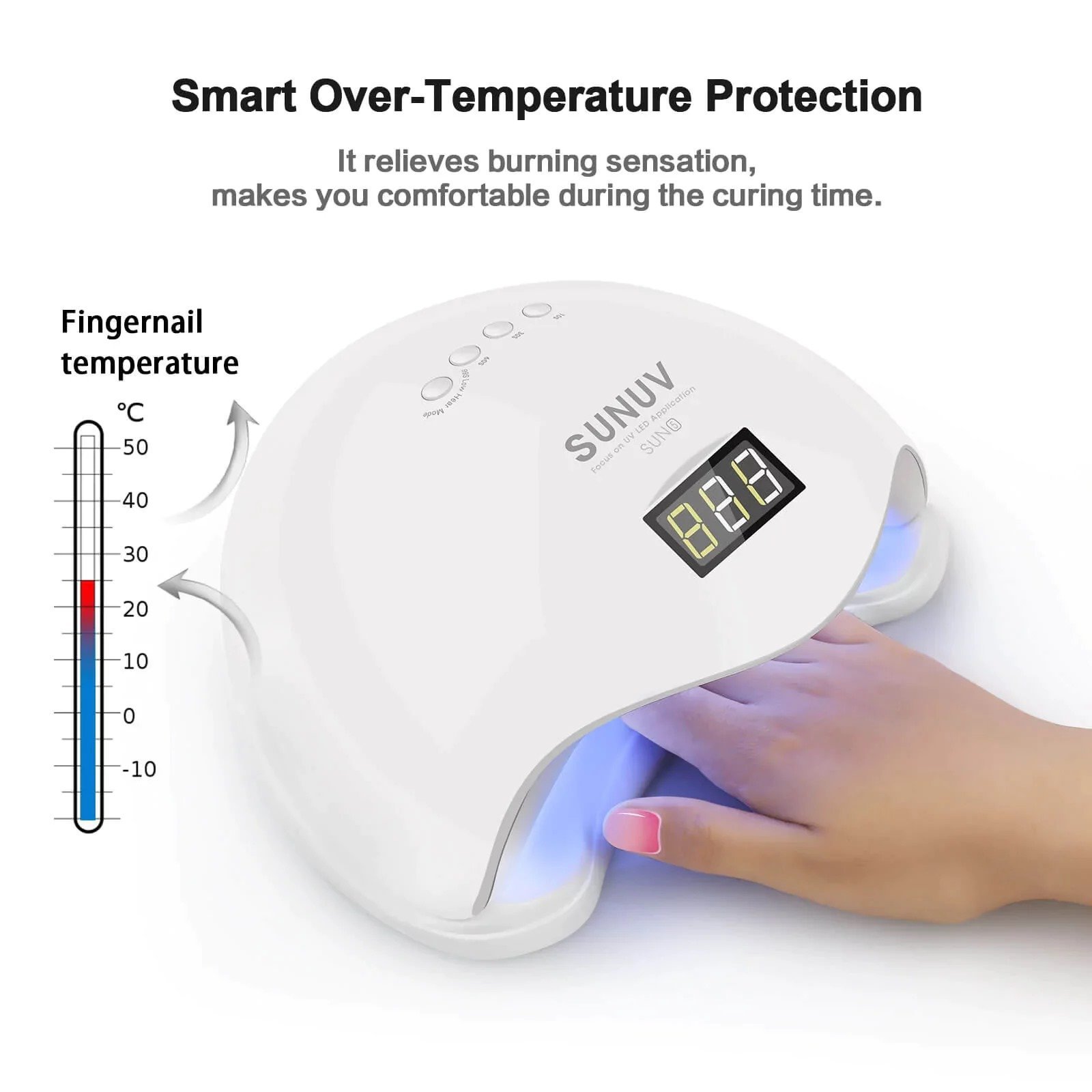 - UNIQUE LOW TEMPERATURE MODE of 99 seconds: suitable for curing builders, hard gels. The power gradually builds up during this operation to protect your tender skin from pain as the gels harden. Compared to the traditional purple nail lamp, these soft closer white lights are not harmful to the eyes. Let’s enjoy comfortable nail art!